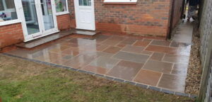 Here we have a black limestone patio surrounded by oak sleepers that have been painted for a darker effect. The patio was jointed with black easy joint and then we decided to go with a contrast colour using porcelain near the back door to separate it from the main patio. We have left half the patio wet so you get an idea of what it looks like in both types of weather.