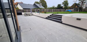 We also installed a very large smoke grey porcelain patio on a two tier level which had drainage channels run along the wall and a black porcelain boarder to give it some contrast.
