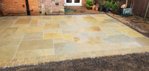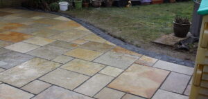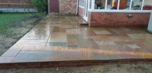 Here we have a black limestone patio surrounded by oak sleepers that have been painted for a darker effect. The patio was jointed with black easy joint and then we decided to go with a contrast colour using porcelain near the back door to separate it from the main patio. We have left half the patio wet so you get an idea of what it looks like in both types of weather.
